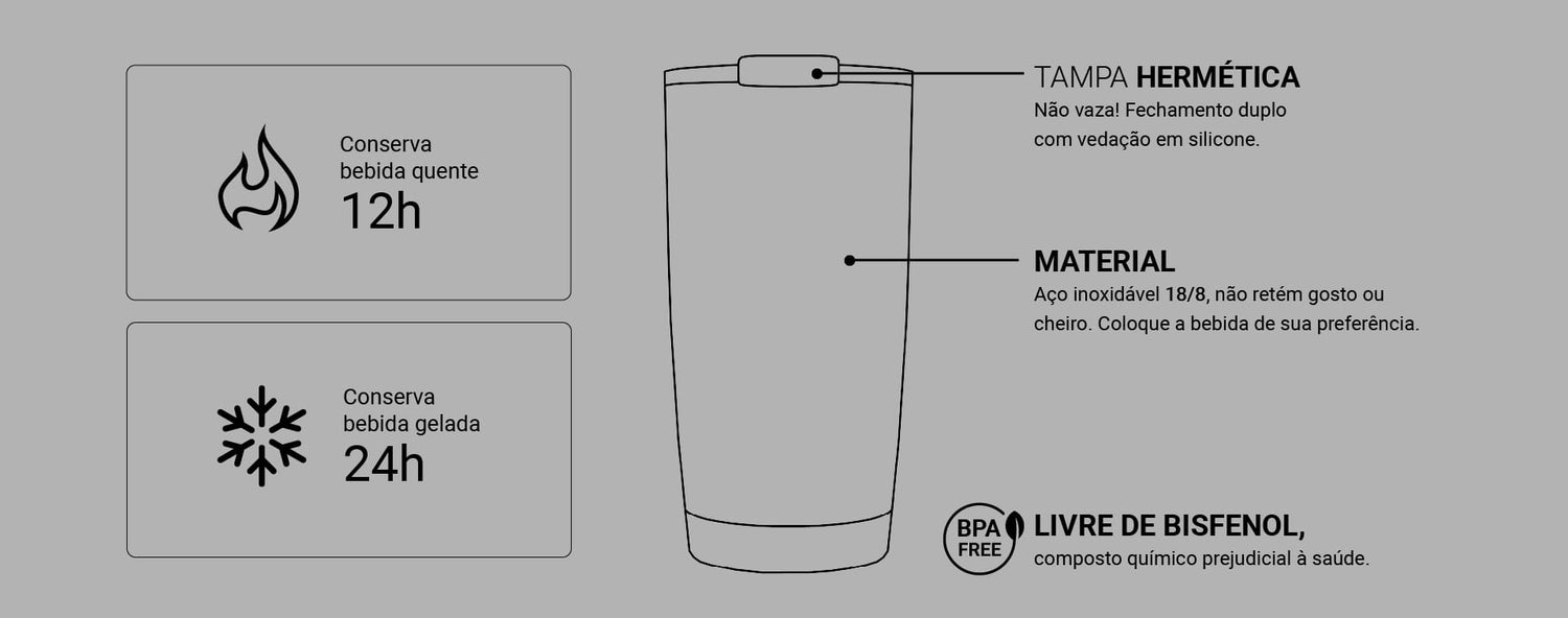 Seu sistema de isolamento térmico garante a conservação da temperatura, seja quente ou fria. Dessa forma, você pode levar sua bebida favorita para qualquer lugar, sem se preocupar com que ela esfrie ou aqueça.
